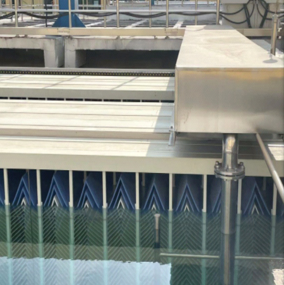 橫掃式斜板除泥裝置,裝在A型斜板填料上部的清洗設備。由小車移動自動清洗斜板上的污泥。該裝置可避開高峰時段,實現智能控制自動運行,采用專項設計管路系統對斜板進行掃洗,使運行時對沉淀后水濁度的影響控制在不影響出水指標的范圍內。